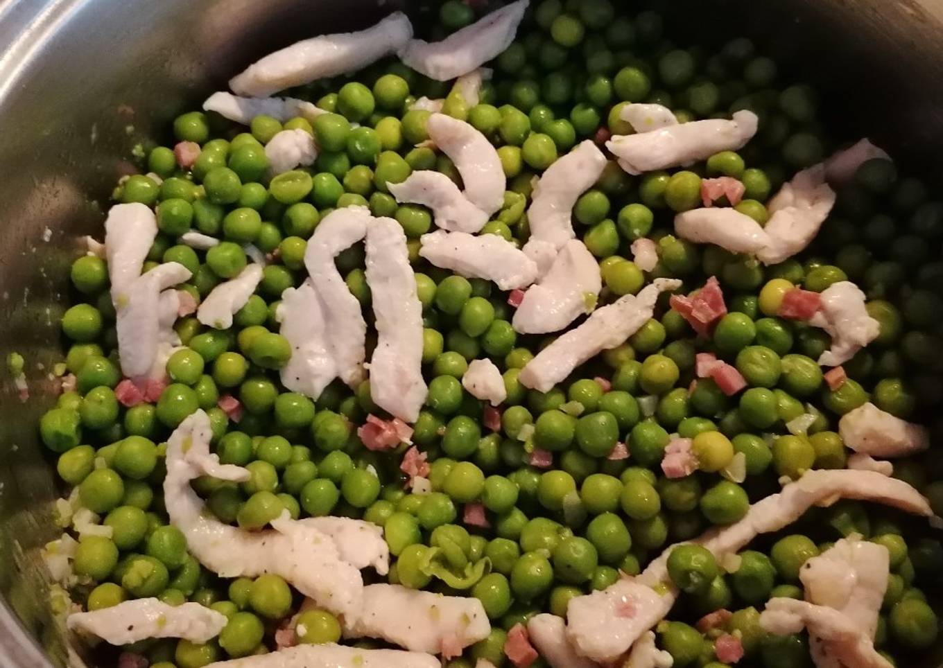 - Cuando esté el pollo añadimos el jamón, damos sólo un par de vueltas, porque sino se queda el jamón muy duro, e incorporamos los guisantes.