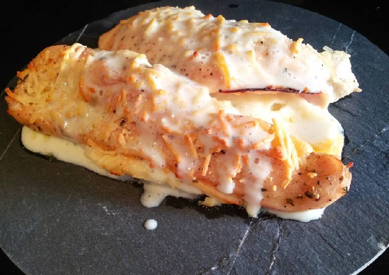 - Una vez abiertas y salpimentadas las pechugas, rellenamos con jamón york y encima la loncha de queso así hasta rellenar todos y cerramos con un palillo para que no se habrán.