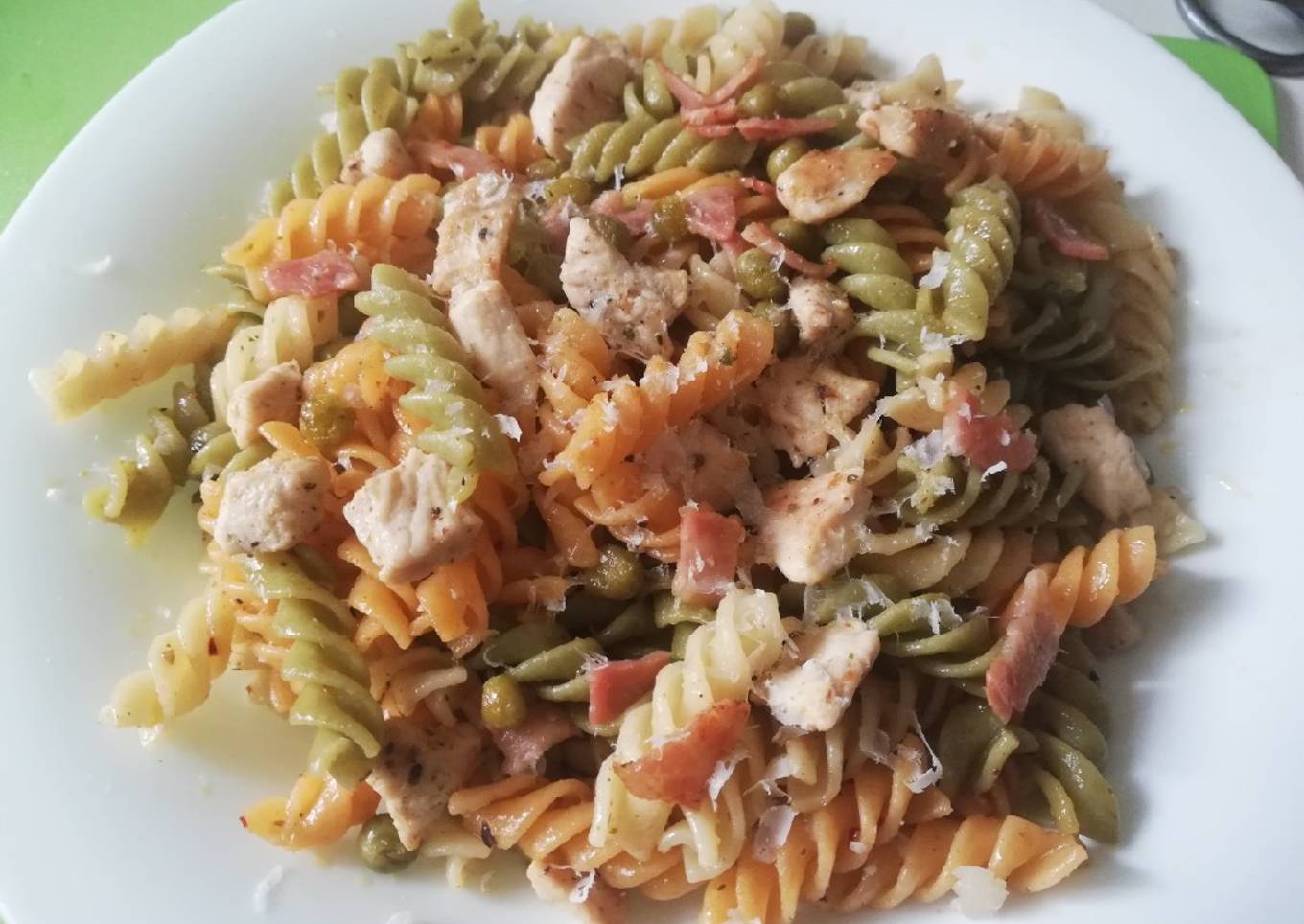 Pasta con pollo y guisantes