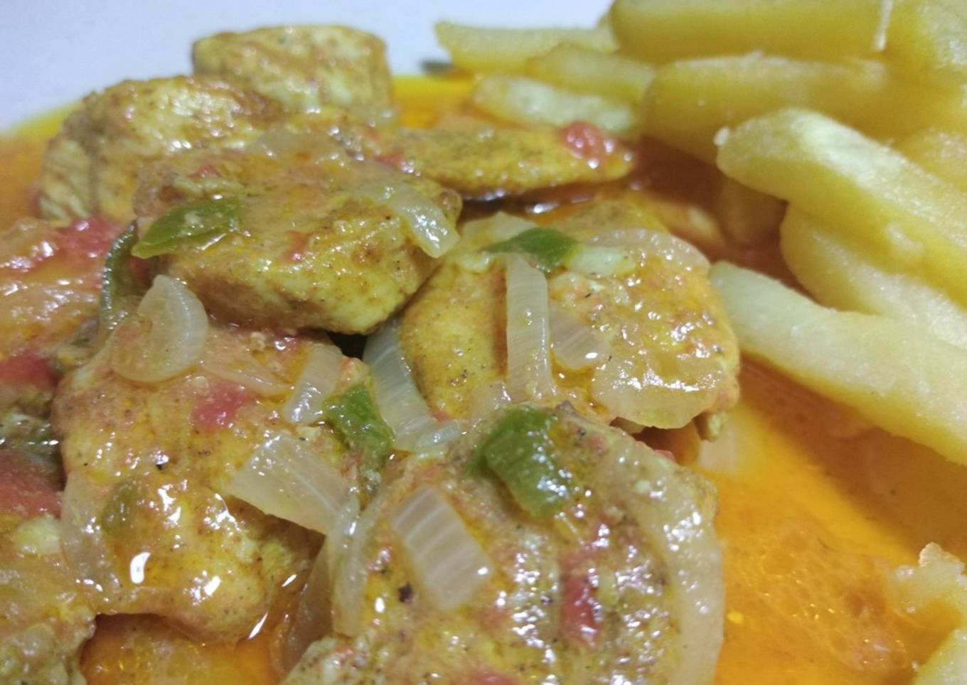 - Cortar el pollo en dados y macerar con el curry, comino, nuez moscada, cúrcuma un diente de ajo y una cucharada de aceite de oliva virgen