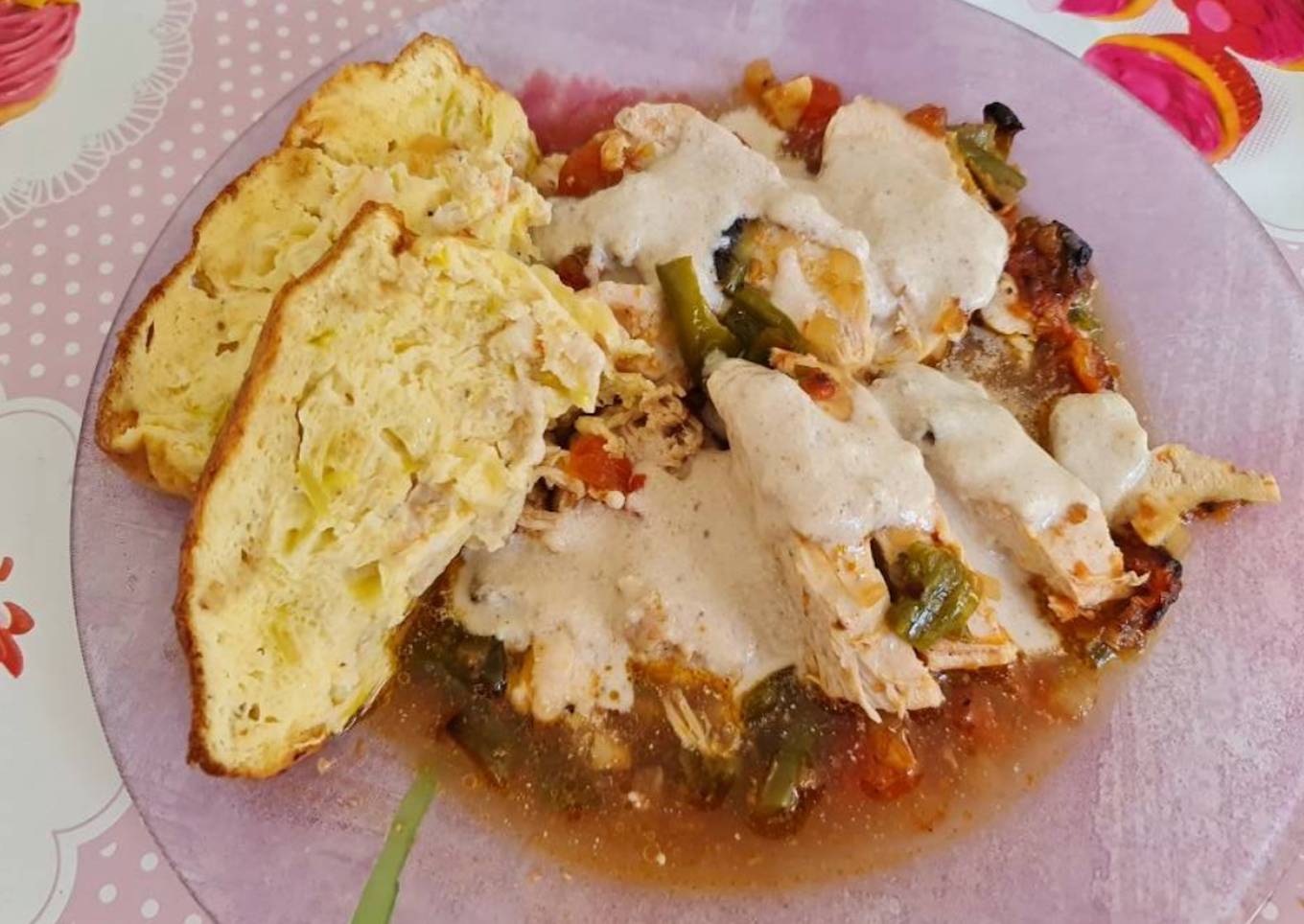 Pastel de puerros y gambas, pollo, verduras y salsa de castaña