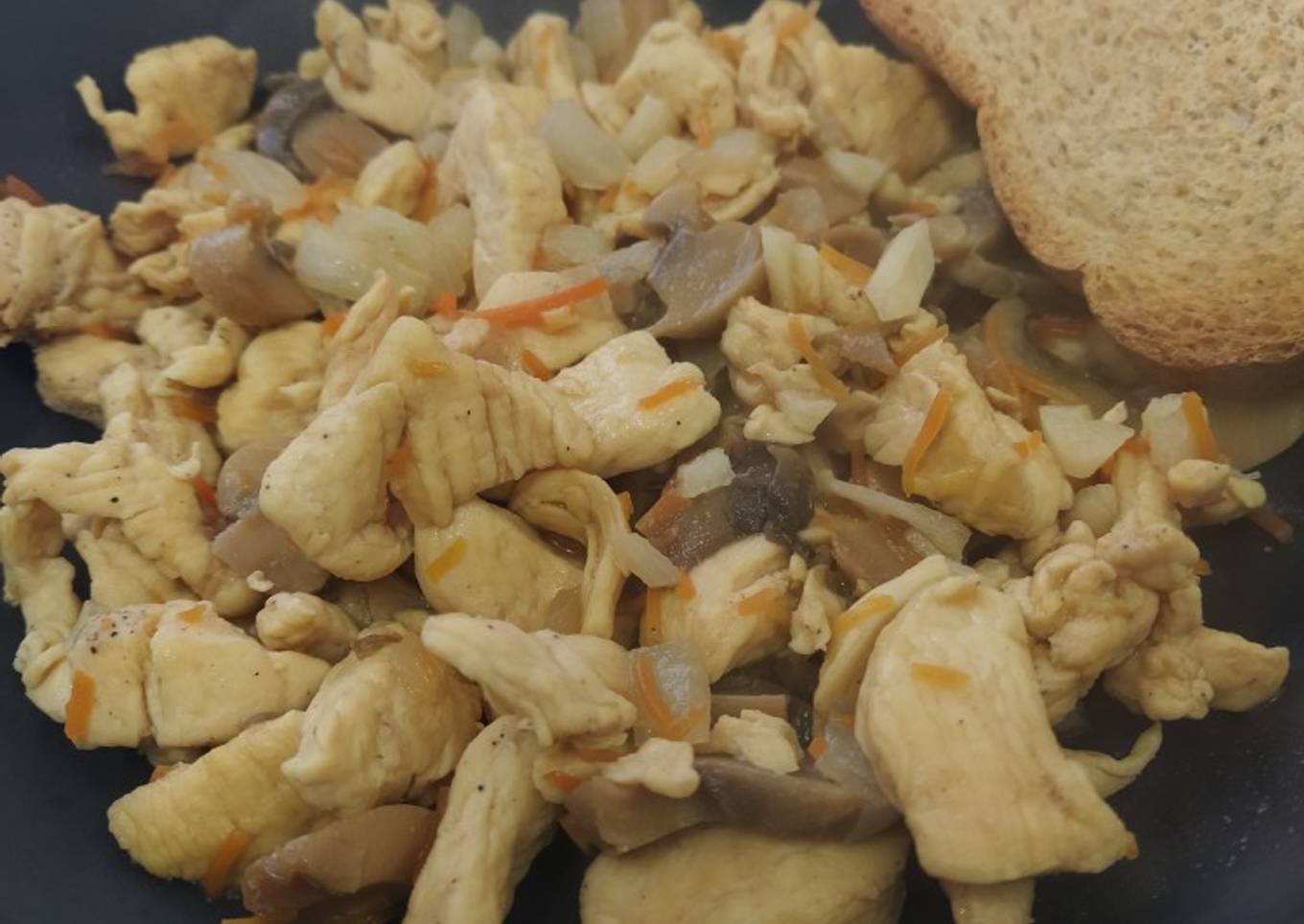 - Cuando veamos la cebolla ponerse transparente añadimos el pollo, la zanahoria rallada y unos champiñones según salgan de la lata, no hace falta cortarlos más.