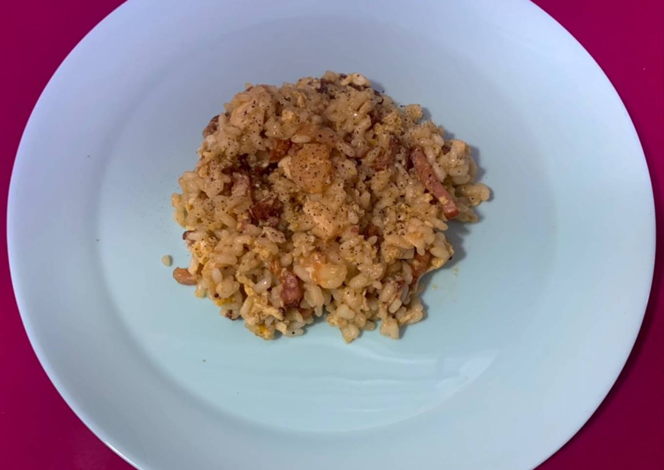 - Una vez esté cocinado el bacon, las gambitas y el pollo, incorporamos un huevo y lo rompemos en la sartén haciendo como unos “huevos revueltos”.