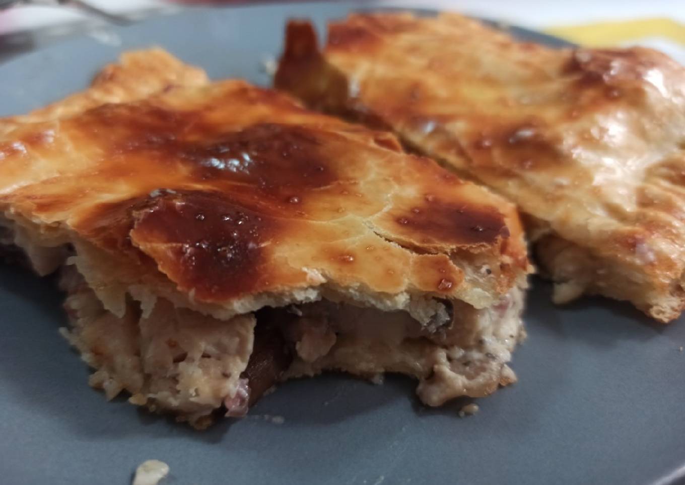 Instructions to make to make Empanada de pollo, bacon y setas, con bechamel