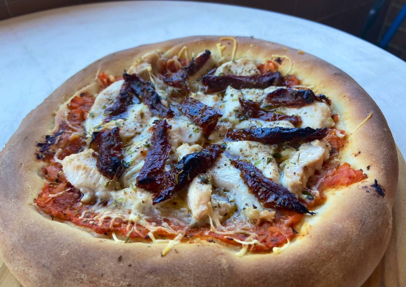 - Disponemos el tomate sobre la masa, el queso y el resto de ingredientes. El pollo se puede poner sin cocinar SOLO si está cortado en trozos muy pequeños que permitan que se cocinen bien en el horno. Es importante comprobar que está hecho, porque el pollo no debe comerse crudo.
