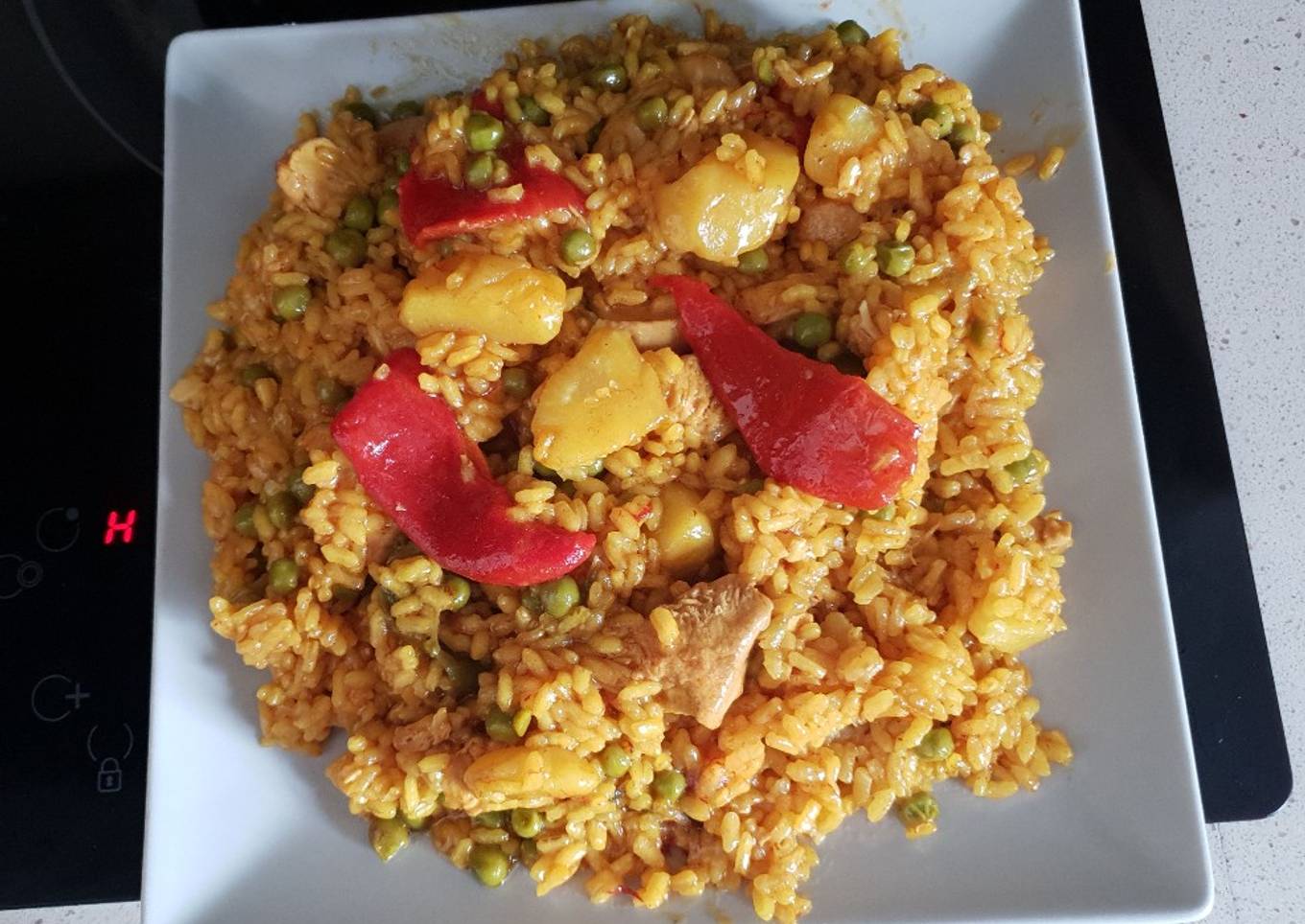 - Ponemos en la olla el aceite y le echamos los pimientos secos limpios y a continuación la pechuga de pollo junto a las hojas de laurel. Cuando el pollo este dorado echamos el pimiento verde, el ajo picado y el tomate. A los 10 min aprox agregamos las patatas, los guisantes, el azafrán, el avecrem y el agua.