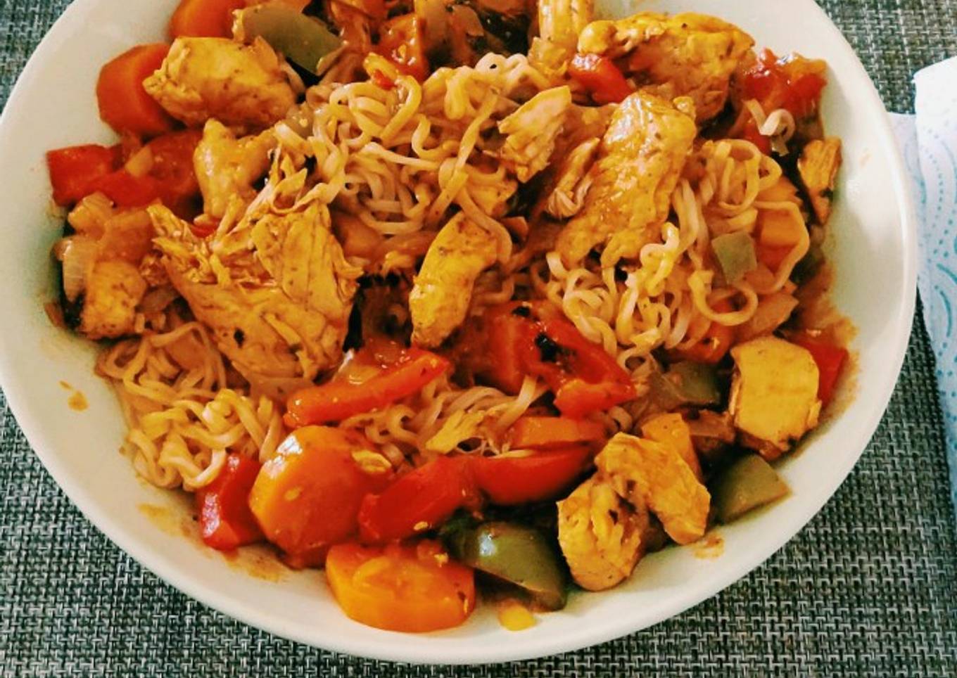 - Pasamos la zanahoria y la cebolla a la olla con el pollo y vertemos la salsa Masala y removemos todos durante 15 min sin que se pegue con los noodles también y listo para servir.