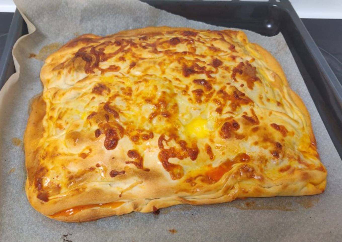 - Vertemos el sofrito de la sartén en la base de la masa y la extendemos. Echamos un poco de queso mozzarella por encima y con la otra masa que nos queda la abrimos y la ponemos encima de nuestra pizza cerrándola. Echamos otro poco de queso mozzarella por encima y horneamos a 200 grados durante 15 min.