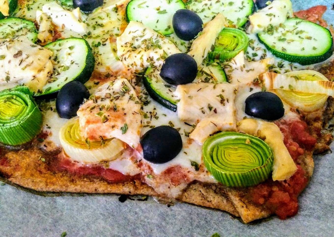 - Píntala con tomate triturado, natural o frito. Luego añade el queso y termina con el puerro lavado y a rodajas, el filete de pollo troceado, las rodajas de calabacín y las aceitunas negras