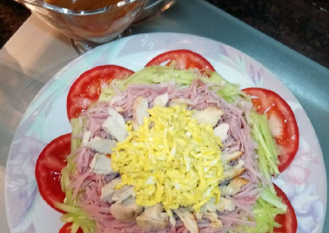 - Hacemos una tortilla muy fina, estilo crêpe cortamos en juliana la tortilla el pepino el jamón de York y el pollo con corte más grueso, cortamos el tomate en rodajas finas y montamos el plato. Primero el tomate luego el pepino seguido del jamón de York el pollo y la tortilla.