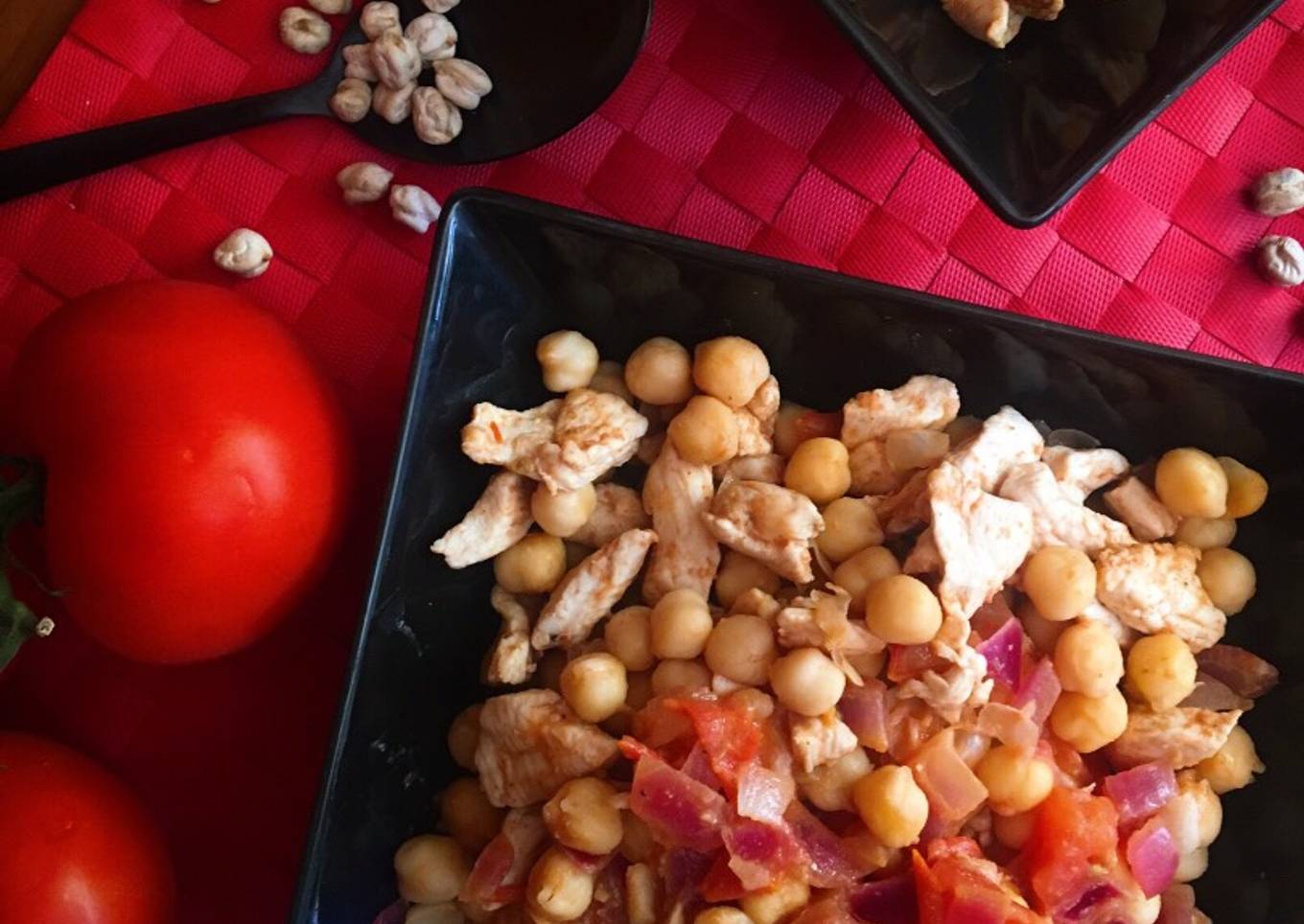 - En una sartén salteamos todos los ingredientes excepto los garbanzos; cuando esté el pollo listo y el líquido reducido, añadimos los garbanzos y listo!
