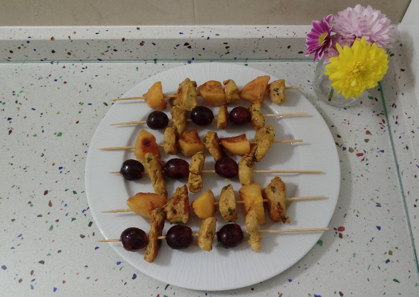 Brochetas de pollo al curry con caquis y uvas caramelizados